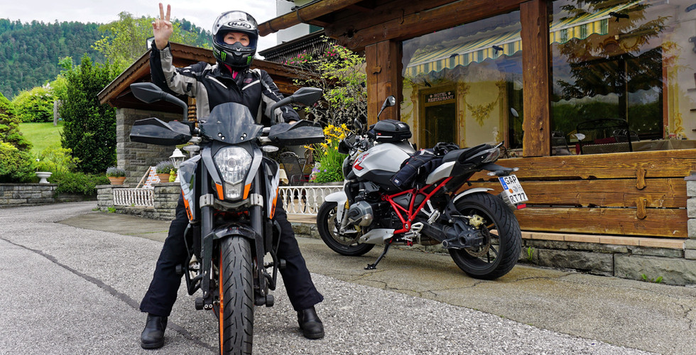 Den passenden Gegenpol bildete Jasmin mit Ihrer KTM Duke 390 - ein richtiger Bergfloh, der dank Akrapovic aber schwer auf Löwe macht :)!